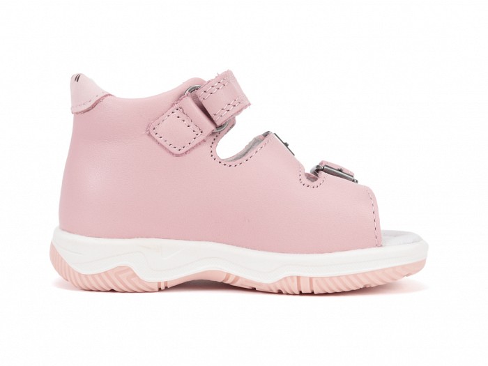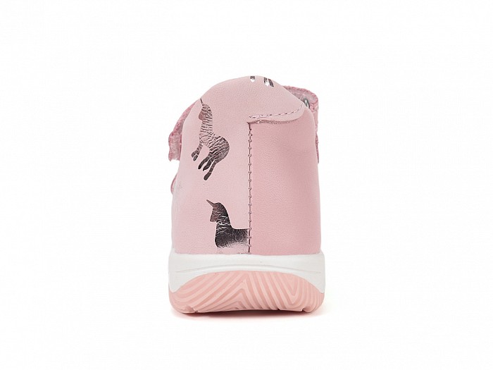 Rózsaszínű bőrből készült, oldalán apró ezüst színű unikornis nyomatokkal díszített, két csatos egy tépőzáras fazonú lány szandál.