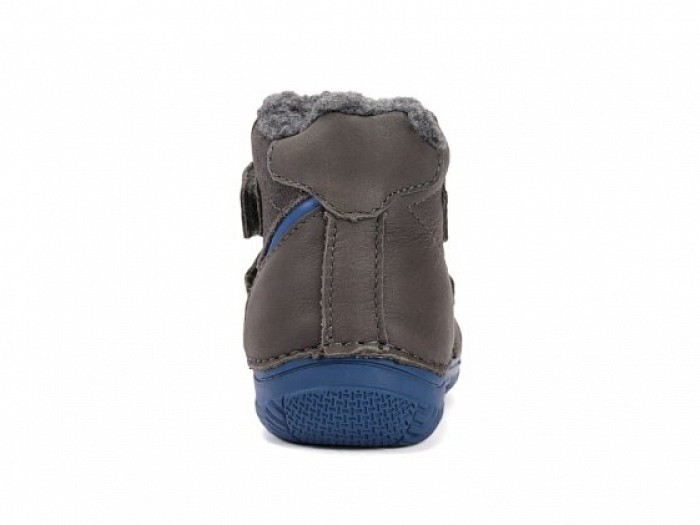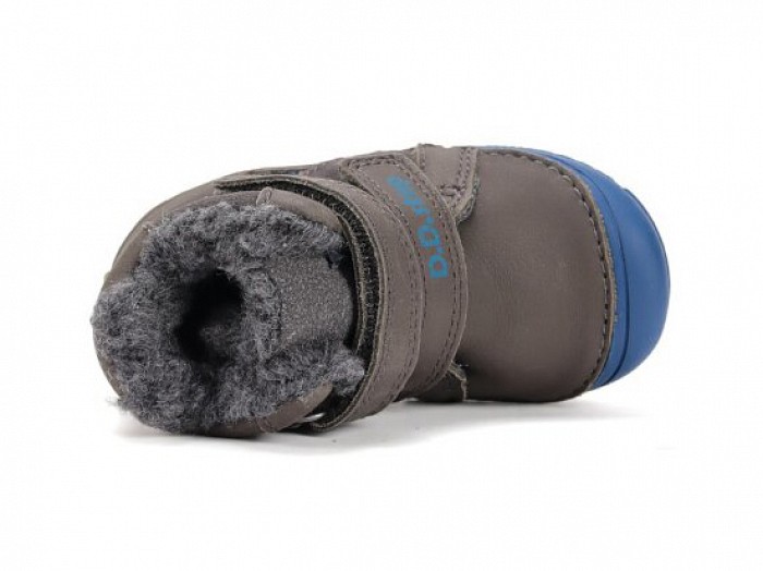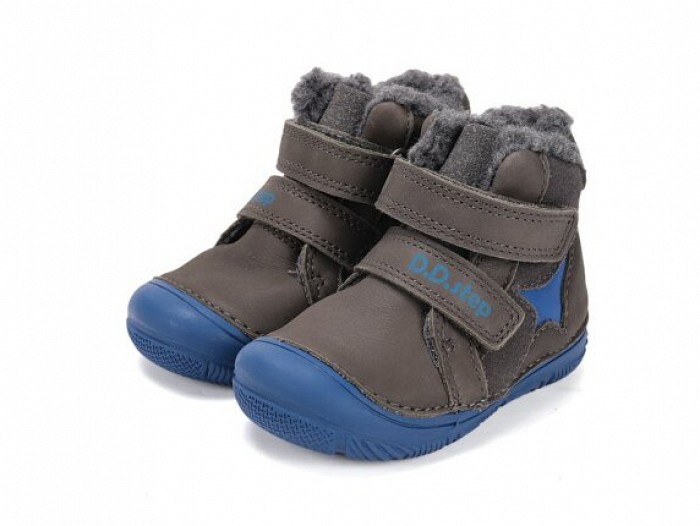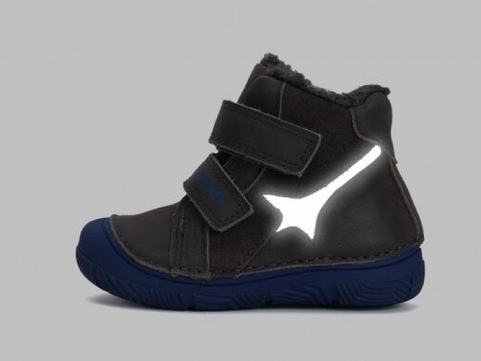 Szürke színű bőrből készült, tépőzáras, meleg bundabéléssel ellátott, fiú cipő, kék betét- és talprésszel díszítve. Sötétben az oldalán lévő minta fényvisszaverős.