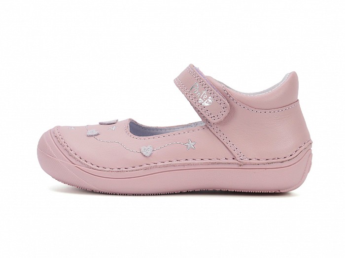 Rózsaszínű bőrből készült, orrvédelemmel ellátott, tépőzáras lány balerina cipő, szivecskés díszítéssel.