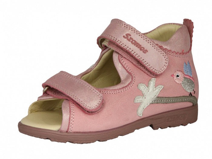 Rózsaszín bőrből készült, tépőzáras, supinált lány szandál, vidám madárkás hímzéssel díszítve. Ez a modell jól megtámasztja és körül öleli a keskeny lábat is.