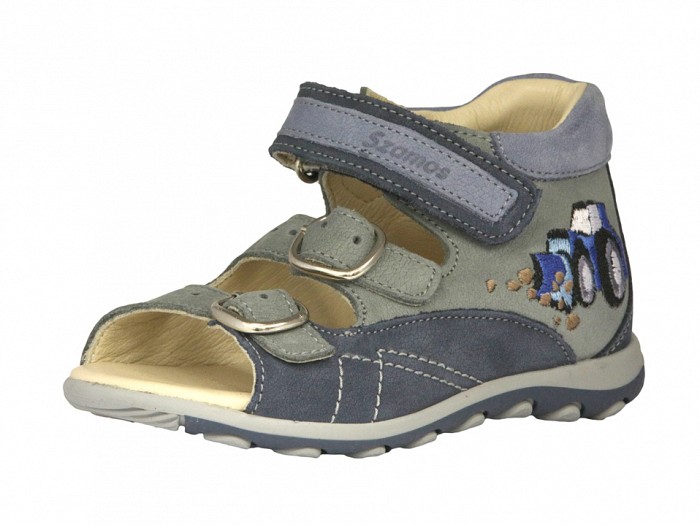 Szürke és kék színű bőrből készült, a bokarész kellő megtámasztásához igazodó, két csatos egy tépőzáras fazonú fiú szandál, oldalán hímzett markolós traktor mintával díszítve.