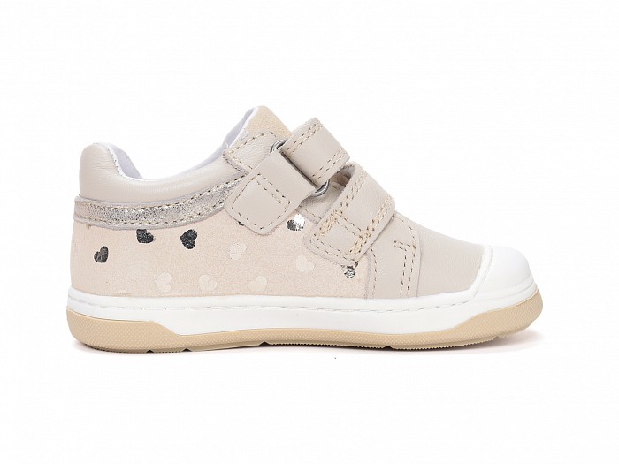 Bézs színű bőrből készült, tépőzáras, gumis orrvédelemmel ellátott, lány supinált félcipő, oldalain és hátulján fényes szivecskés nyomattal díszítve.