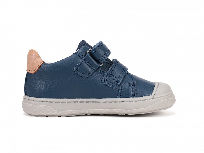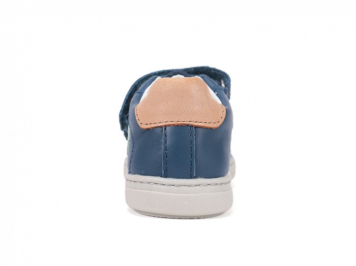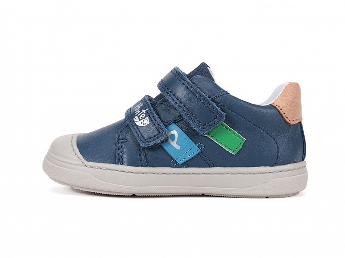 Sötétkék színű bőrből készült, tépőzáras, gumis orrvédelemmel ellátott, supinált fiú félcipő, oldalán színes díszítéssel.