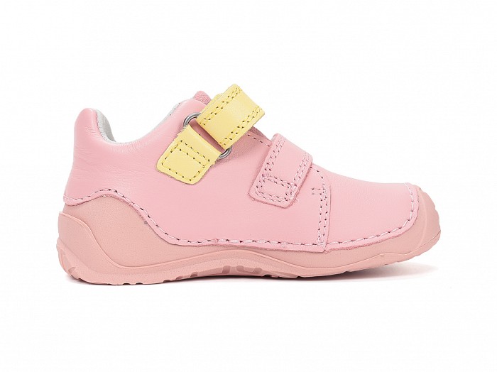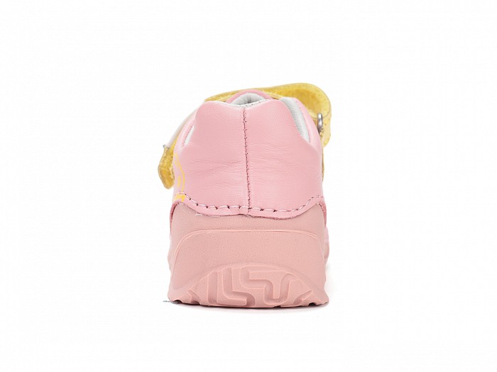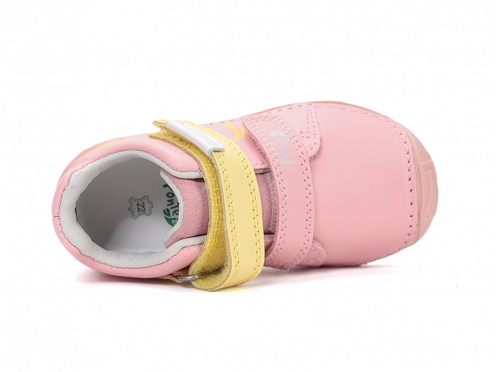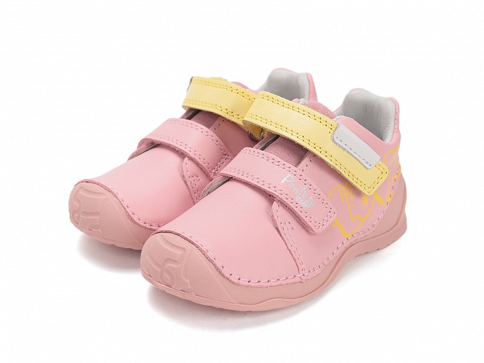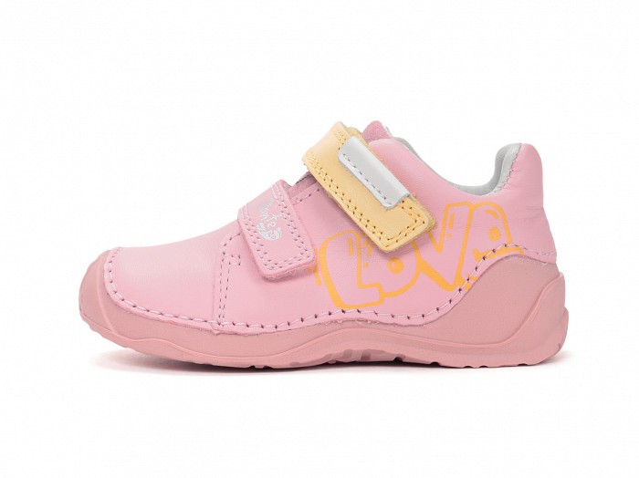 Rózsaszínű bőrből készült, gumis orrvédelemmel ellátott,  tépőzáras lány supinált cipő, oldalán sárga "LOVE" felírattal díszítve.