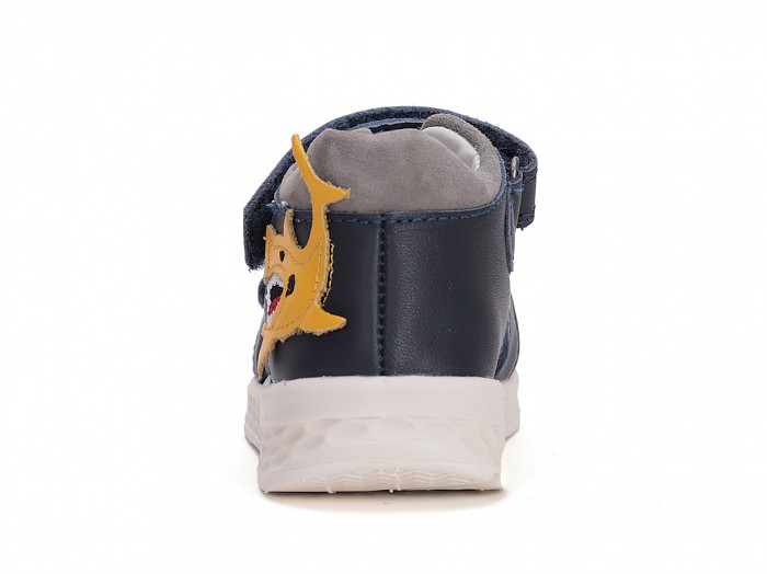 Sötétkék színű bőrből készült, tépőzáras, supinált fiú szandál, oldalán narancssárga cápás mintával díszítve.