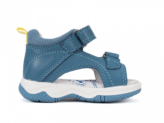 Kék színű bőrből készült, két tépőzárral ellátott, fiú szandál a meleg nyári napokra.