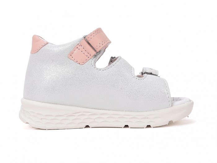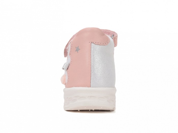 Ezüst és lazac színű bőrből készült, két csatos egy tépőzáras fazonú, supinált lány szandál, oldalán szőrös nyuszis mintával díszítve.