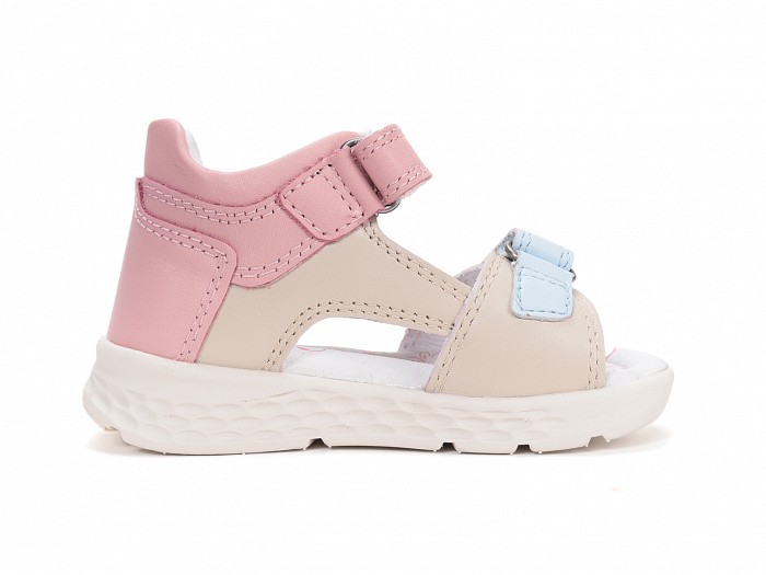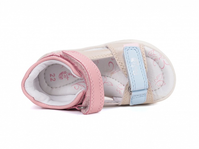 Rózsaszínű-bézs-világoskék színkombinációjú bőrből készült, két tépőzáras fazonú, supinált lány szandál.