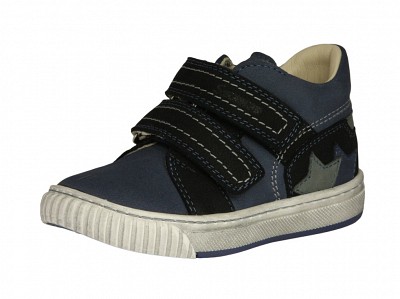 Farmerkék színű bőrből készült, tépőzáras fiú cipő, fekete és zöld díszítéssel.